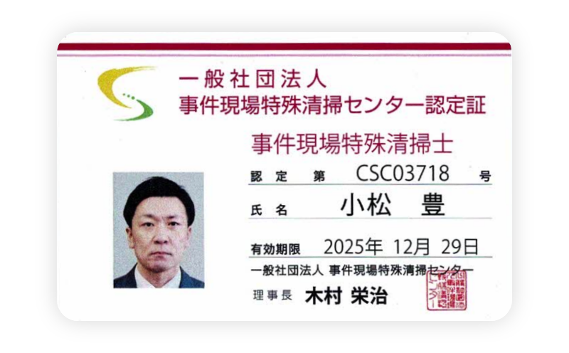 今回の写真は私の事件現場特殊清掃士の認定証です。
