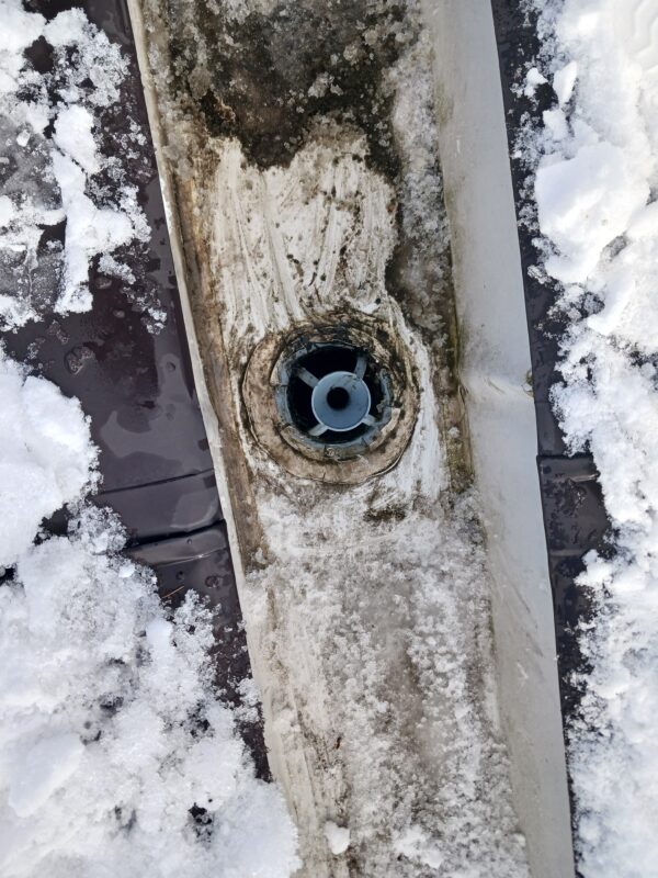 積雪が無い状態ですと、排水ドレン部以外の屋根上の落ち葉など掃き掃除で全て綺麗にしているのですが、今回は積雪状態でしたので排水溝と排水ドレン部付近の詰まりチェックと清掃となります。
