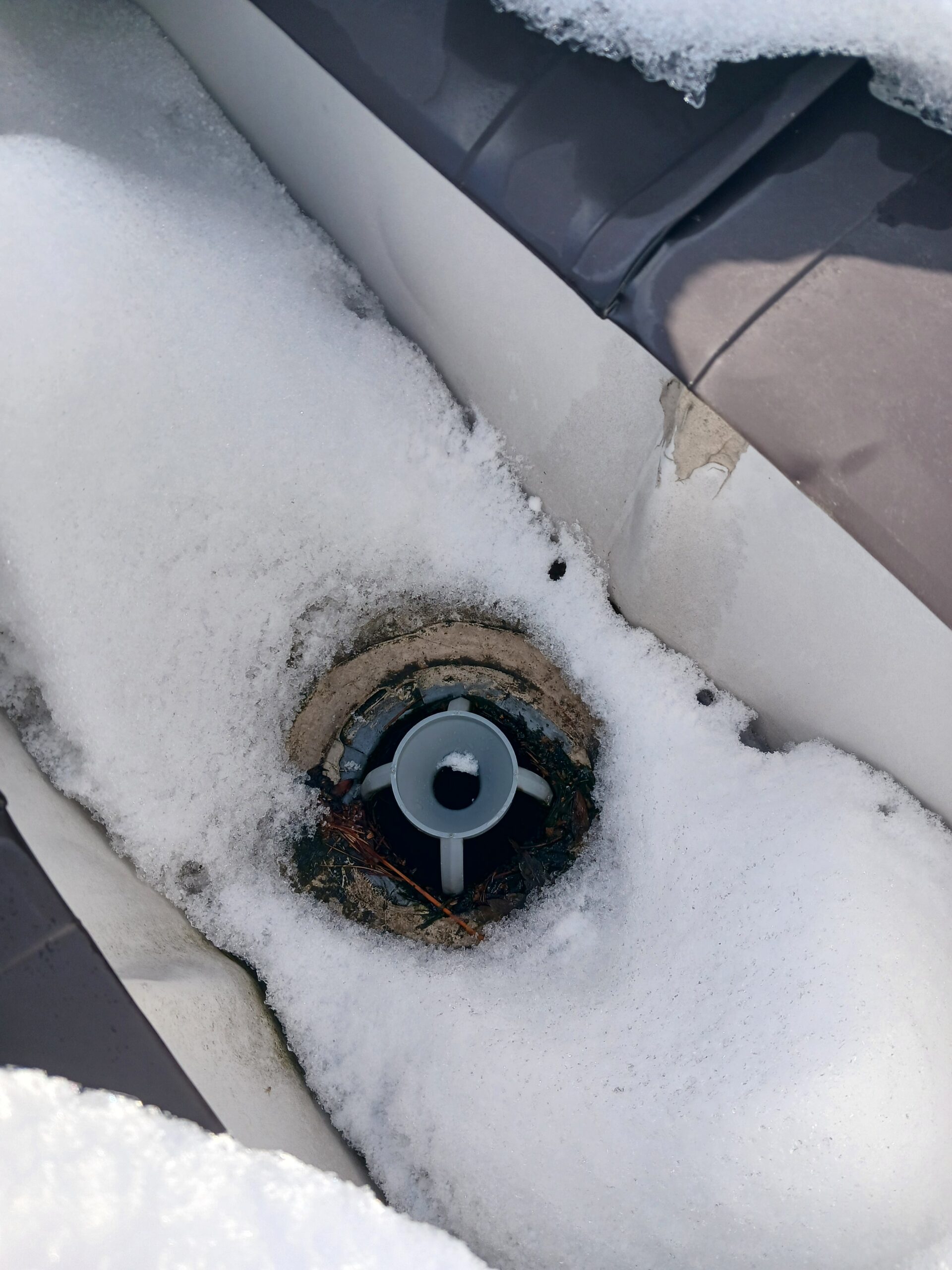 数年前に排水ドレンを一度詰まらせてしまって以来、雪が降る前には詰まりのチェックと清掃を行っていましたが、やろうやろうと思っているうちに雪が降ってきてしまって困っているとの事。