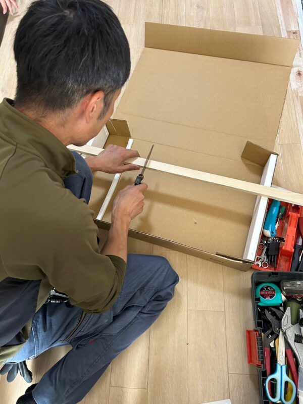 窓枠の形状にはまる木の部材を購入し、切断穴あけを現地で寸法を合わせて制作します。