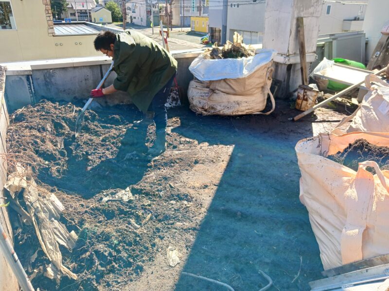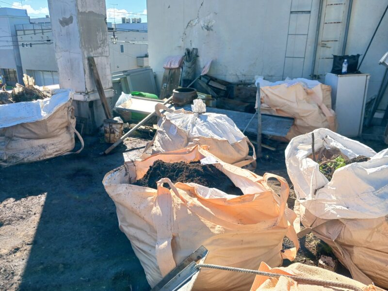 まずは中二階のテラス部の廃棄物を一掃して、その後屋上の物に取りかかる手はずで進めて行きます。